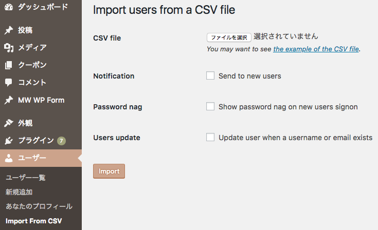 CSVファイルが完成したら、WordPress管理画面の「ユーザー」→「Import from CSV」から設定画面を開きます。